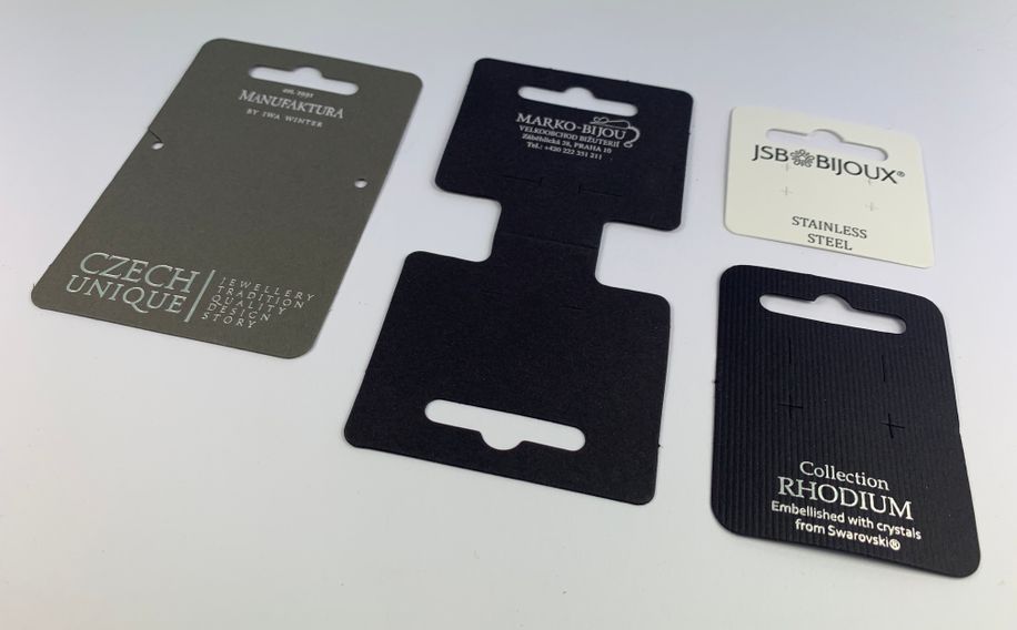 Velký výběr karet s eurozámkem na zavěšení bižuterie (náušnice, řetízek, náramek…) - více jak 200 druhů. Karty typu manžet k uchycení výrobku. Na přání vyrobíme jakýkoliv rozměr a typ karty. Potisk horkou ražbou.