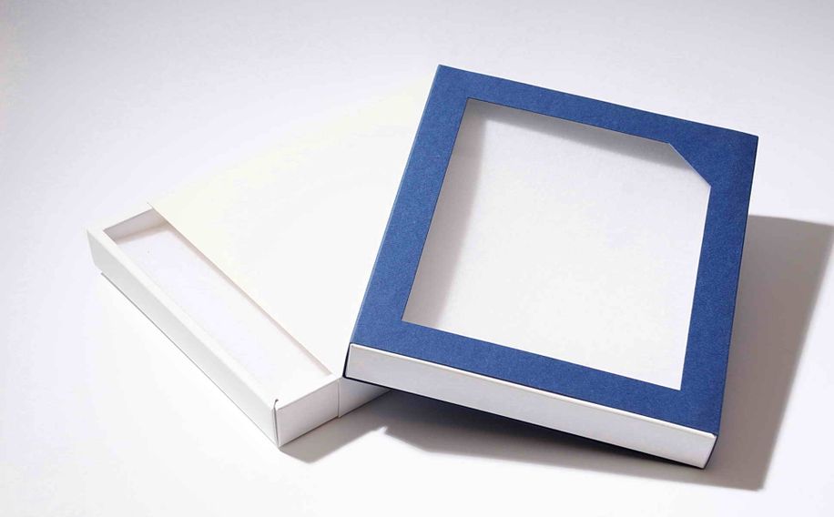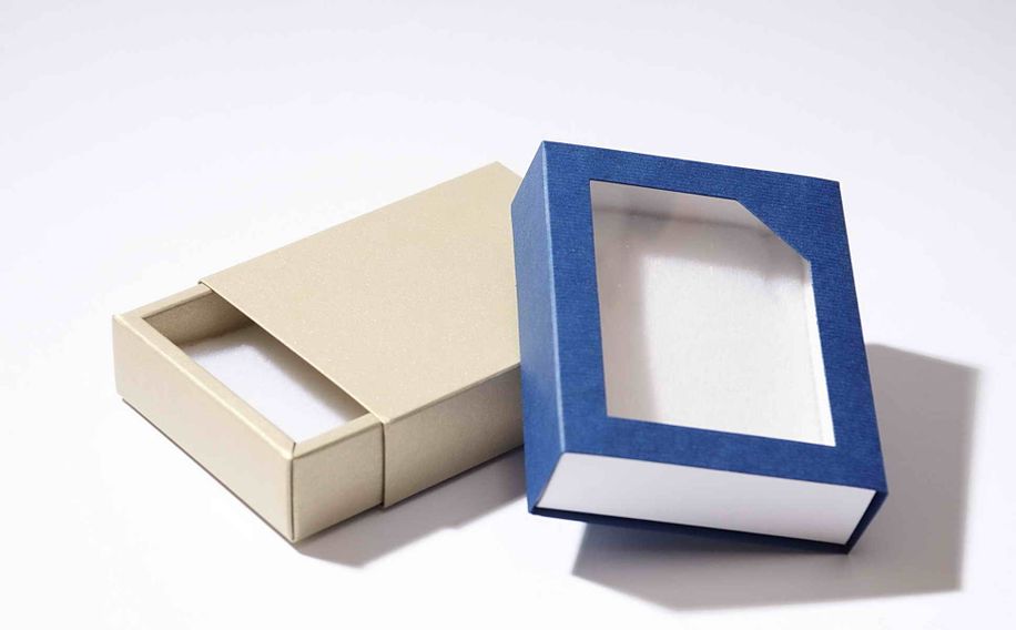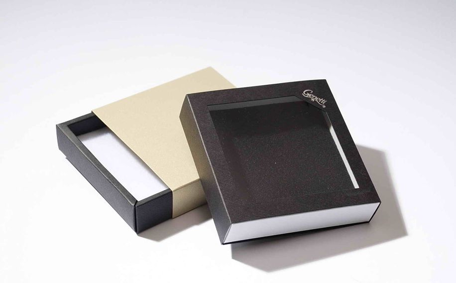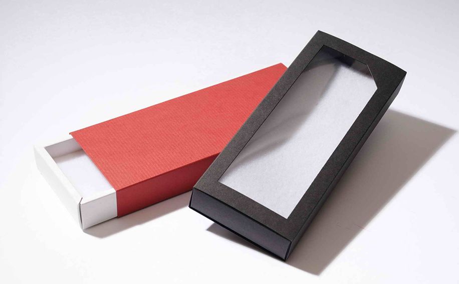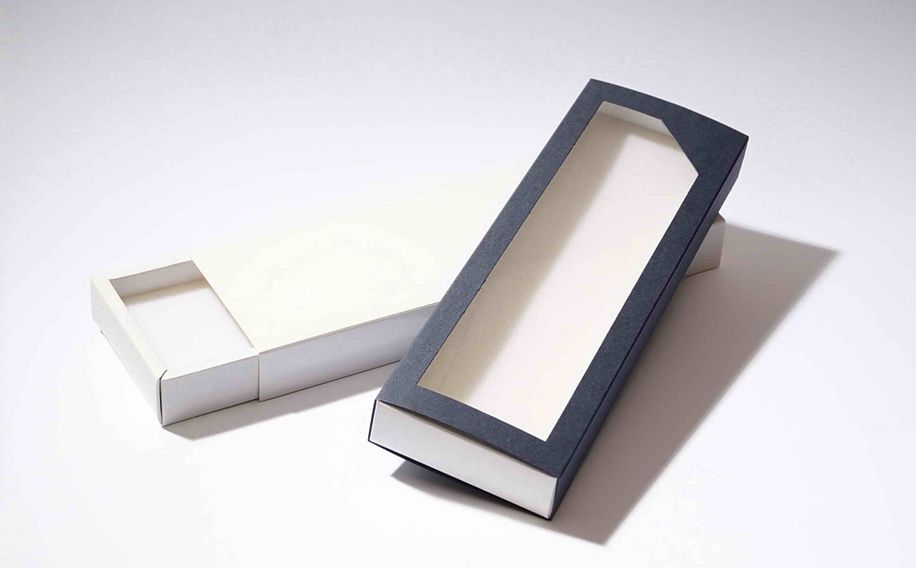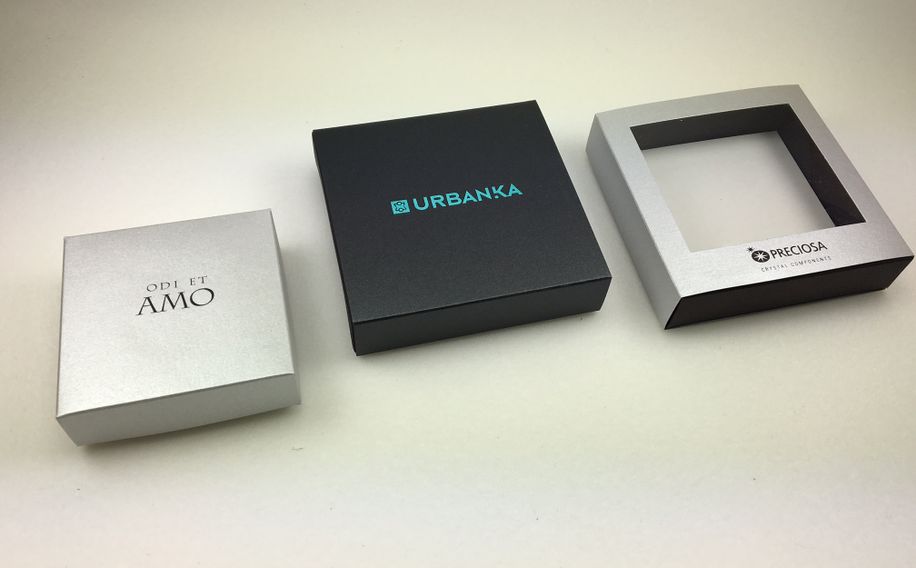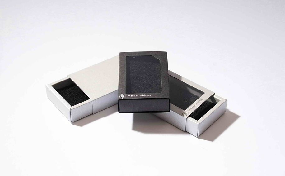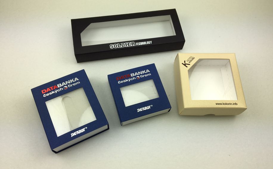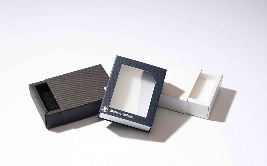 Krabičky se zasunovacím přebalem, varianta s okénkem i bez okénka, uvnitř krabiček buď molitan nebo papírová vložka, možný potisk logem do rohu přebalu s okénkem.